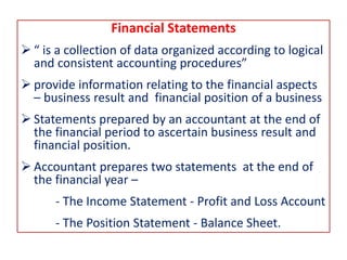 This document provides an overview of key concepts related to financial statements. It defines financial statements as organized collections of financial data according to accounting procedures. The two main financial statements are the income statement (also called the profit and loss account) and the balance sheet. The income statement shows revenues and expenses over a period of time, while the balance sheet presents the assets, liabilities, and capital of a business at a point in time. The document also discusses concepts like different types of profits, classification of assets and liabilities, and the nature and purpose of financial statements.