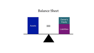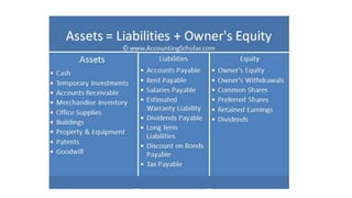Financial statements include the balance sheet, income statement, and statement of cash flows. The balance sheet summarizes a company's financial position at a point in time by listing assets, liabilities, and equity. It uses the accounting equation that assets equal liabilities plus equity. The income statement summarizes revenues and expenses over a period of time to determine profit or loss. The statement of cash flows explains the changes in a company's cash balance due to operating, investing, and financing activities during a period.