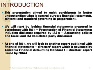 The document outlines the framework for general-purpose financial statements in compliance with various International Accounting Standards (IAS) and Tanzania Financial Reporting Standards (TFRS), focusing on requirements for presentation, disclosures, and reporting. It emphasizes the purpose and elements of financial statements, including financial position, performance, and cash flows, as well as additional considerations such as related party disclosures and directors' reports. Key features include compliance, materiality, and the necessity for comparative information in financial reporting.