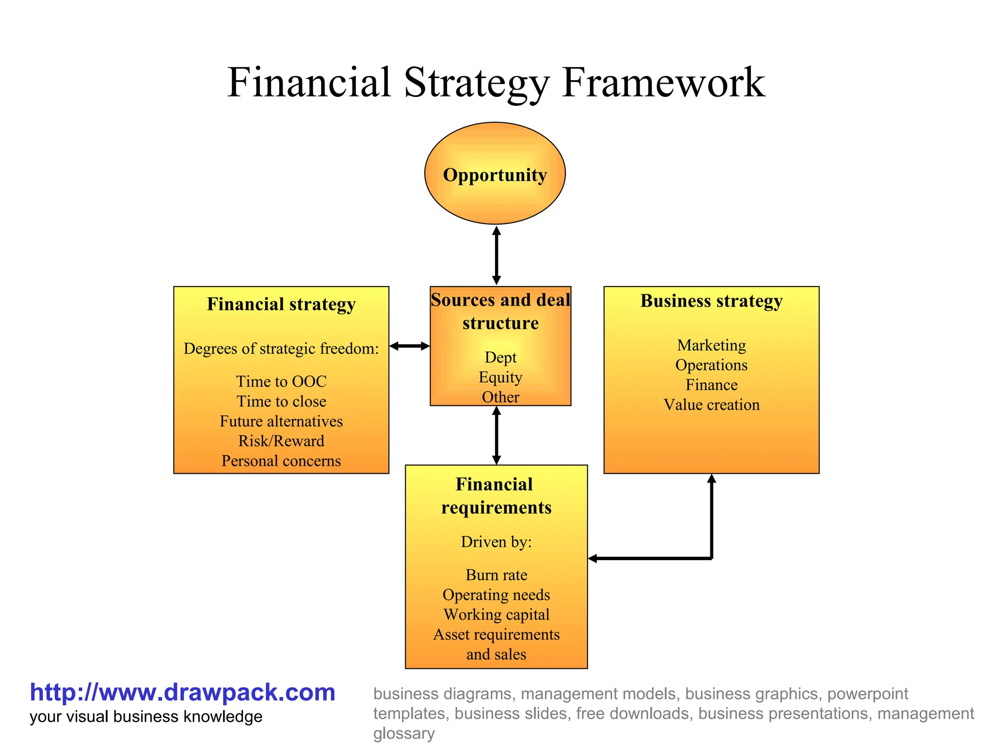 Financial Strategy Frameworkhttp://www.drawpack.com your visual business knowledge business diagrams, management models, business graphics, powerpoint templates, business slides, free downloads, business presentations, management glossary Financial strategy Degrees of strategic freedom: Time to OOC Time to close Future alternatives Risk/Reward Personal concerns Business strategy Marketing Operations Finance Value creation Sources and deal structure Dept Equity Other Financial requirements Driven by: Burn rate Operating needs Working capital Asset requirements and sales Opportunity