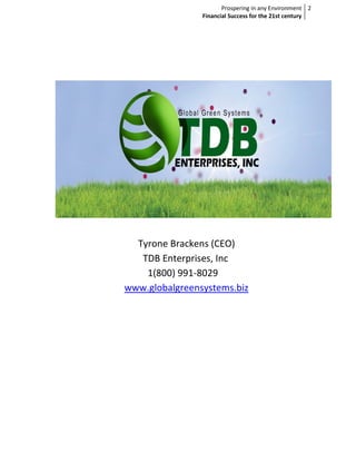 This document is an e-book titled "Financial Success for the 21st Century" by Tyrone Brackens. It aims to teach principles of financial success through 12 years of research. Brackens has studied the Bible, attended seminars, and watched wealth videos to equip readers to succeed financially. He encourages readers to apply the information through reading the e-book multiple times. The e-book covers topics like persistence, giving, reading, humility, and dreaming to unlock financial prosperity in every area of life. It is dedicated to Brackens' parents for their support and includes a foreword on spiritual wealth and tapping into infinite opportunities.