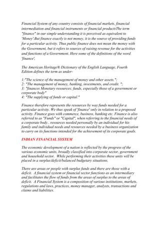 This document provides an overview of the Indian financial system. It discusses key components of the system including financial markets, instruments, intermediaries and their functions.