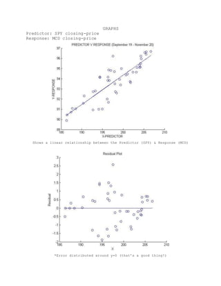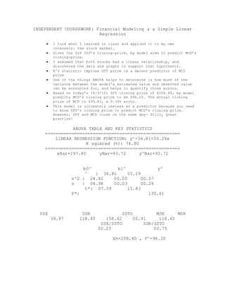 The student conducted an independent linear regression analysis to model the relationship between the closing prices of the S&P 500 ETF (SPY) and McDonald's (MCD) stock. A linear regression model was fitted with MCD closing price as the response variable and SPY closing price as the predictor variable. The model found a statistically significant linear relationship between the two variables, with SPY price explaining about 75% of the variation in MCD price. When using the model to predict MCD's closing price based on SPY's actual later closing price, the model prediction was within 0.4% of the actual MCD price.