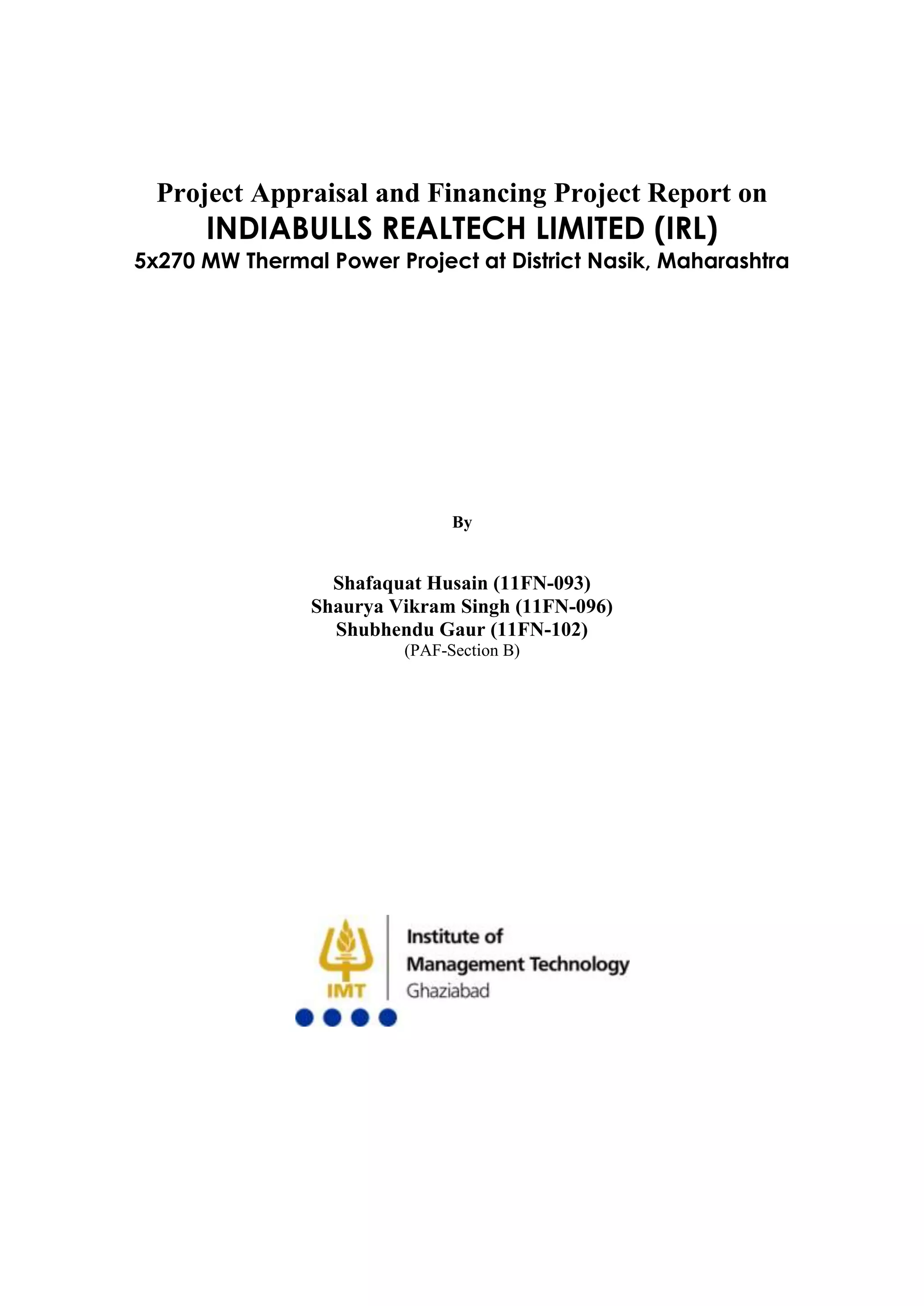 The document provides details of a proposed 1350 MW thermal power project in Nasik, Maharashtra by Indiabulls Realtech Limited. Key details include: