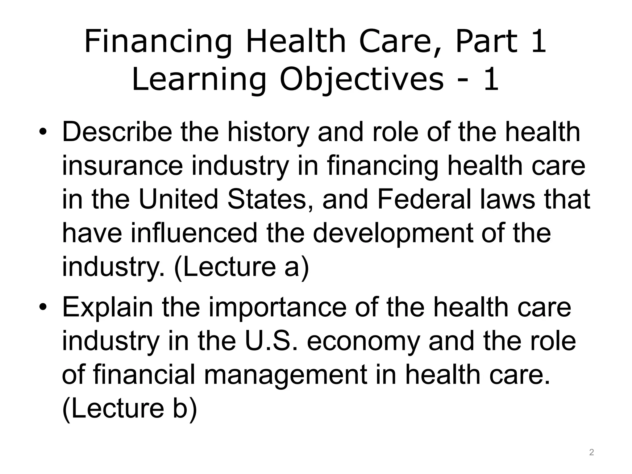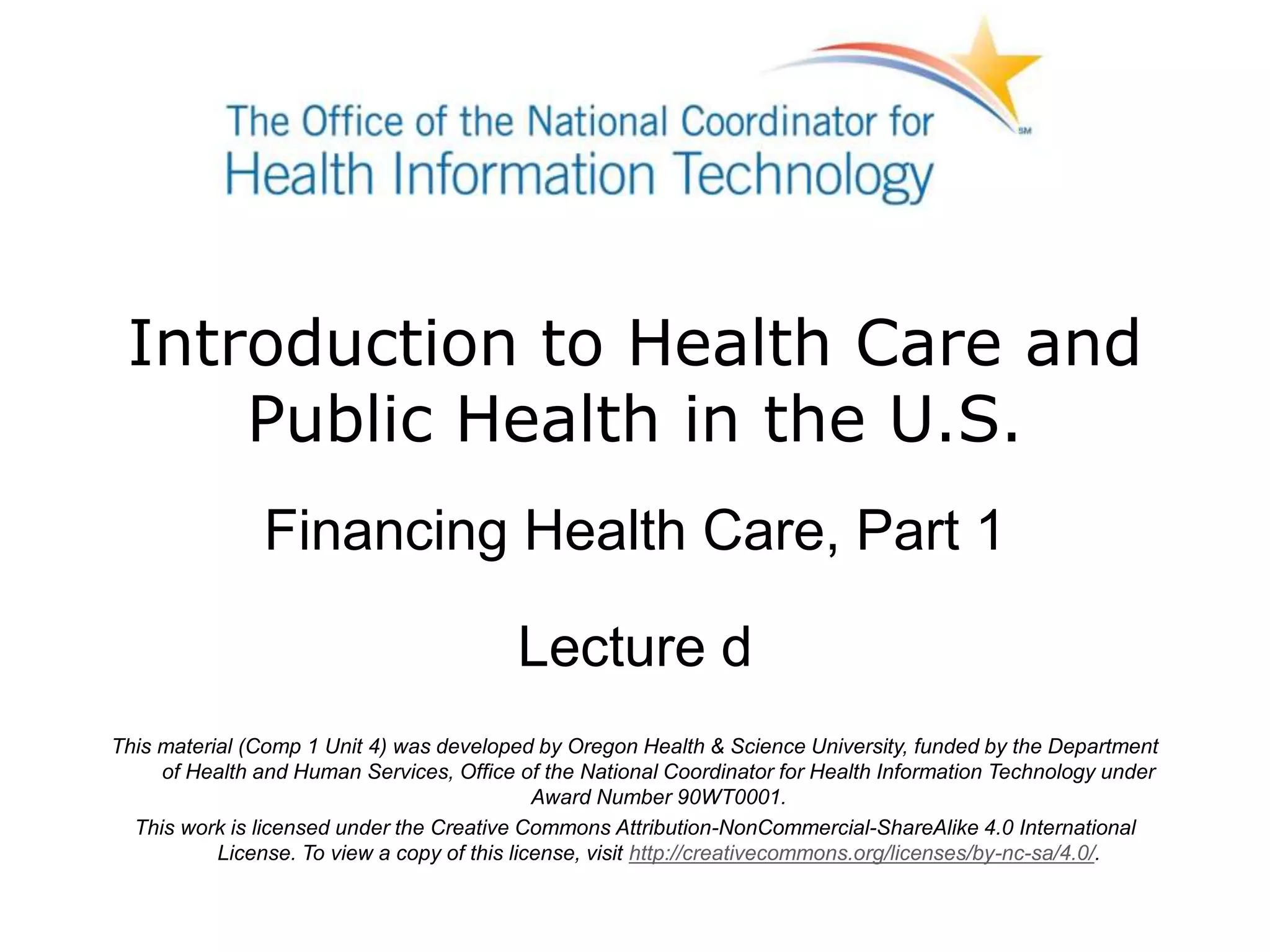 This document is a lecture on financing health care in the United States. It discusses how health insurance works by spreading risk over large pools of people. Insurers pay providers based on diagnosis and procedure codes, using contracted rates. The lecture describes the types of private health insurance like indemnity plans, Blue Cross/Blue Shield, and various managed care plans. It also discusses the roles of government programs like Medicare and Medicaid, as well as laws regulating private insurance such as ERISA, COBRA, HIPAA, and the Affordable Care Act.