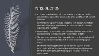 The document discusses the financing of current assets, categorizing them into cash or assets convertible to cash within a year, and describes various approaches to financing such assets including matching, conservative, and aggressive strategies. It elaborates on different financing sources like spontaneous liabilities, trade credit, public deposits, commercial paper, and inter-corporate deposits, outlining their advantages and disadvantages. Key insights on fund-based assistance by commercial banks for exporters are also provided, covering pre-shipment and post-shipment finance.