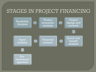 This document discusses project financing. It provides an overview of the stages of project financing, sources of financing, participants and criteria. It also discusses principal agreements, project risks, and risk identification through due diligence. Project financing refers to financing of long-term infrastructure, industrial projects, and public services based on a non-recourse or limited recourse financial structure where project debt and equity used to finance the project are paid back from the cashflow generated by the project.