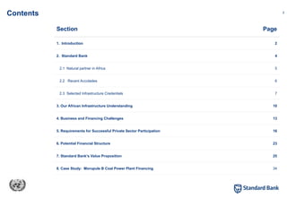 The document outlines Standard Bank's role and capabilities in financing power projects across Africa, highlighting its extensive presence in 17 countries and emphasizing its understanding of the region's infrastructure needs. It discusses challenges and requirements for successful private sector involvement in power projects, along with examples of ongoing projects the bank is involved in. The document serves to present Standard Bank as a key partner for financing and advisory in the African energy sector.