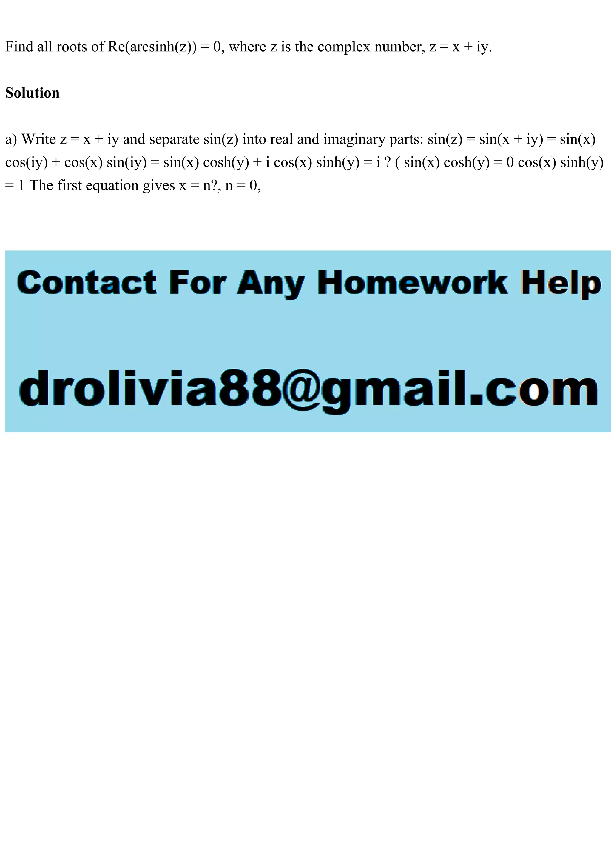 The document presents a problem involving the roots of the equation re(arcsinh(z)) = 0 for the complex number z = x + iy. It explains how to separate sin(z) into real and imaginary components to analyze the equations that arise. The solution starts by setting up equations based on the real and imaginary parts derived from the sine function.
