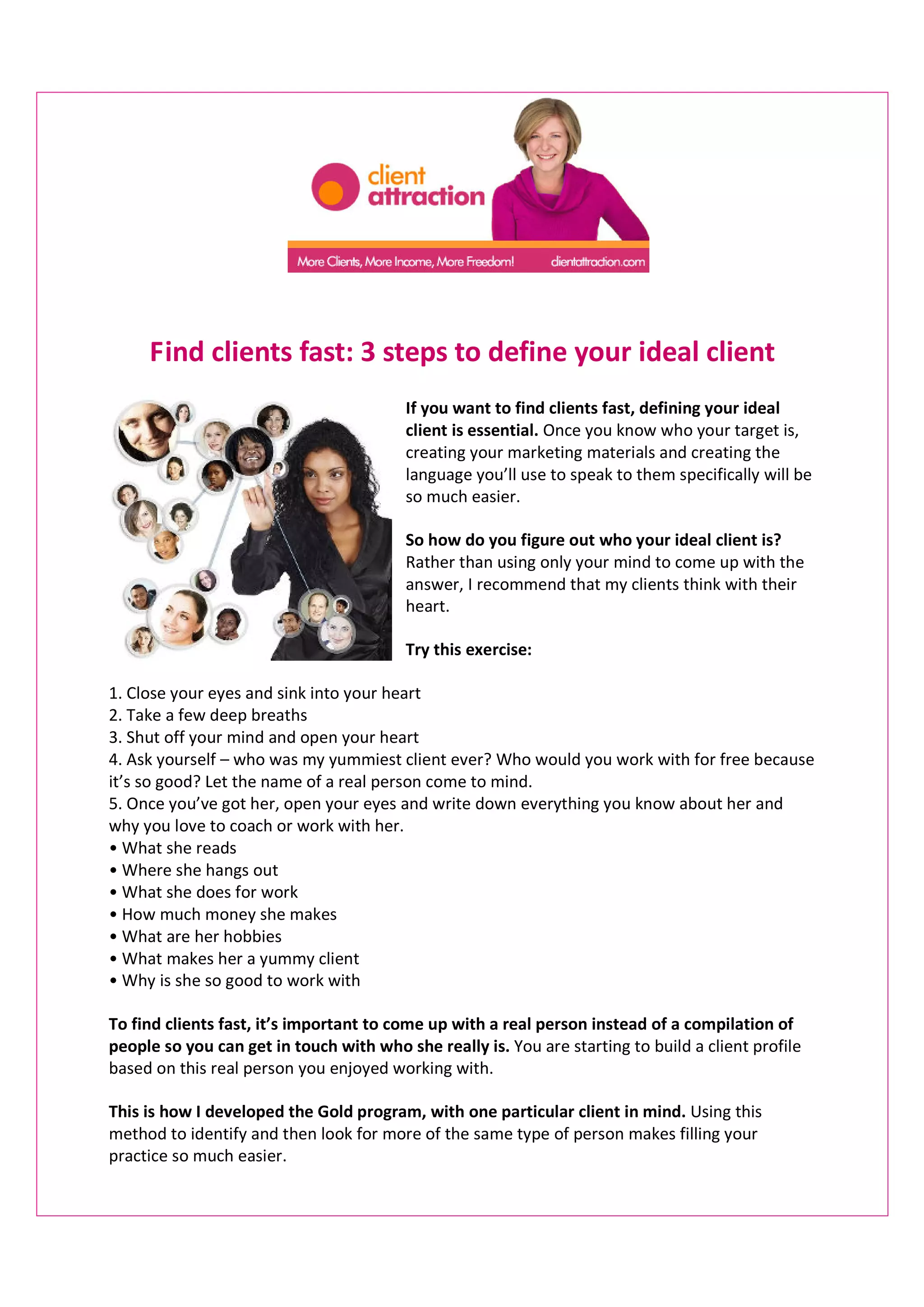 The document outlines a three-step process to help define your ideal client in order to attract them quickly. It emphasizes the importance of identifying a specific person who embodies your ideal client rather than a general concept, encouraging introspection to create a detailed client profile. Fabienne Fredrickson promotes her Client Attraction System as a method to achieve this goal efficiently.
