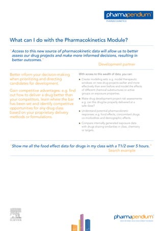 The pharmacokinetics module provides unprecedented access to a vast database of pharmacokinetic data from various regulatory sources, enabling professionals to make better-informed drug development decisions. Users can search and filter data based on numerous parameters, including drug exposure, dose, and demographic differences, thus streamlining their research efforts. This module supports improved project risk assessments and competitive positioning by delivering insights on therapeutic candidates and their pharmacokinetic profiles.