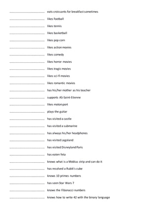 This document provides a list of over 50 experiences and interests and asks the reader to provide the name of someone they know who has done each one, with the goal of finding connections between people's lives. Some of the experiences mentioned include traveling to various countries and landmarks, engaging in different hobbies and activities, experiencing different movies and sports, and demonstrating various academic and mathematical knowledge.