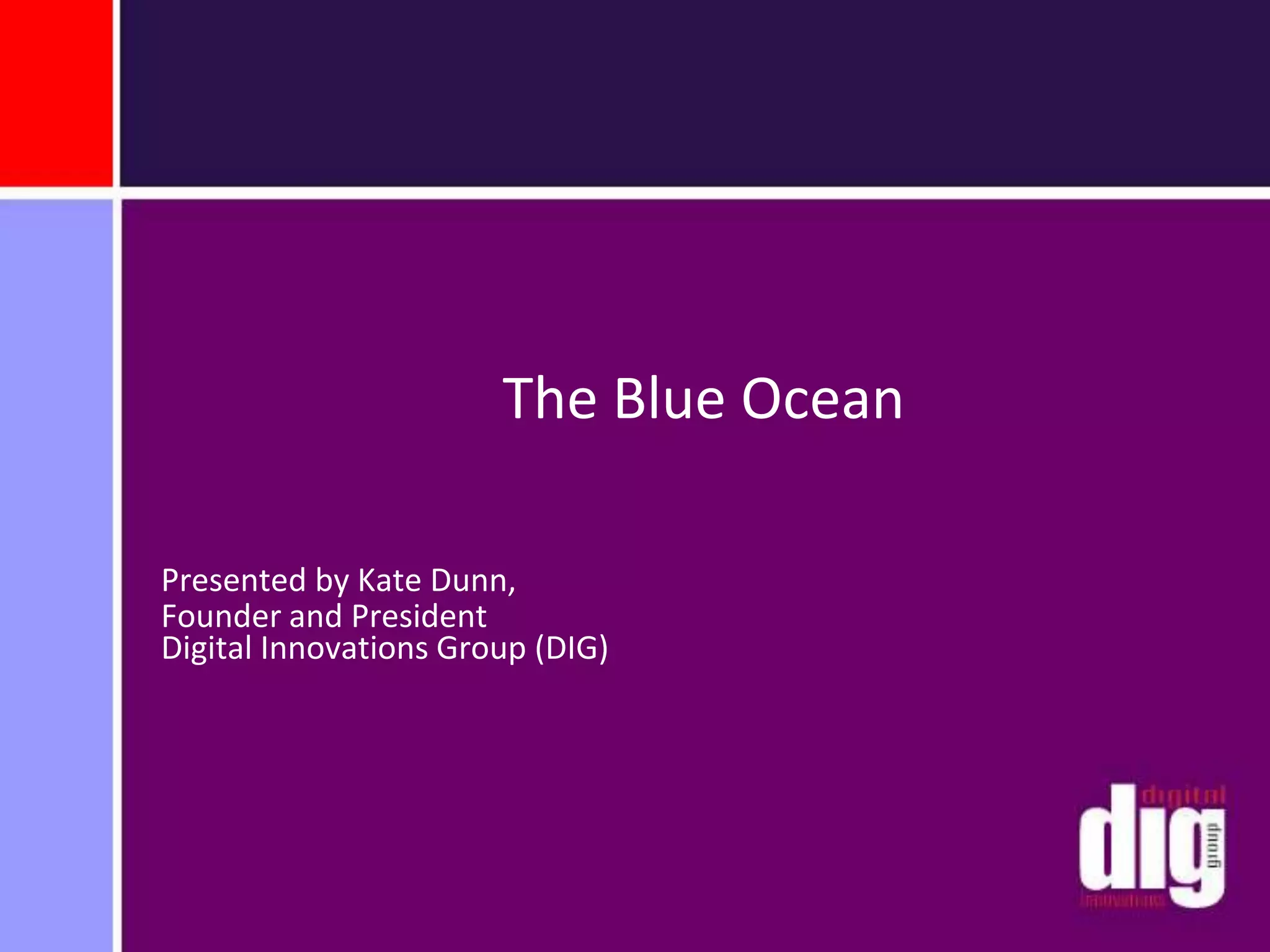This document discusses creating value through blue ocean strategy and finding new market spaces. It emphasizes differentiating yourself by focusing on a niche and developing clear competitive advantages. Specifically, it recommends combining integrated digital marketing services with a targeted micro-niche and reinforcing your unique value through perseverance to become remarkable and profitable.