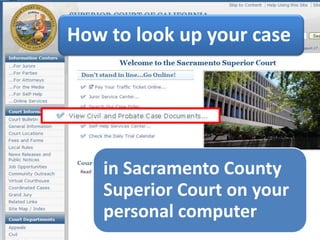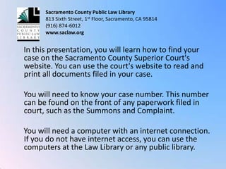 This document provides instructions on how to access case documents on the Sacramento County Superior Court's website using your case number. Users can view and print their legal documents via the court's online portal or in-person at public libraries. It emphasizes the necessity of having a computer with internet access and guides users through the steps to find and review their case documents.