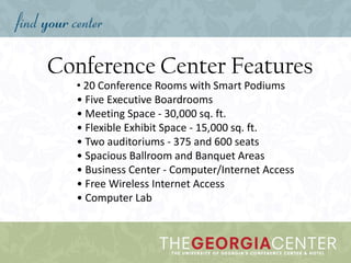 The document provides details about the facilities and services available at the Georgia Center conference center located near the University of Georgia campus. It has over 30,000 square feet of meeting space along with two auditoriums that can seat up to 600 and 375 people respectively. The center also has a 200-room hotel and offers dining options, free wifi, and amenities to support conferences and events.