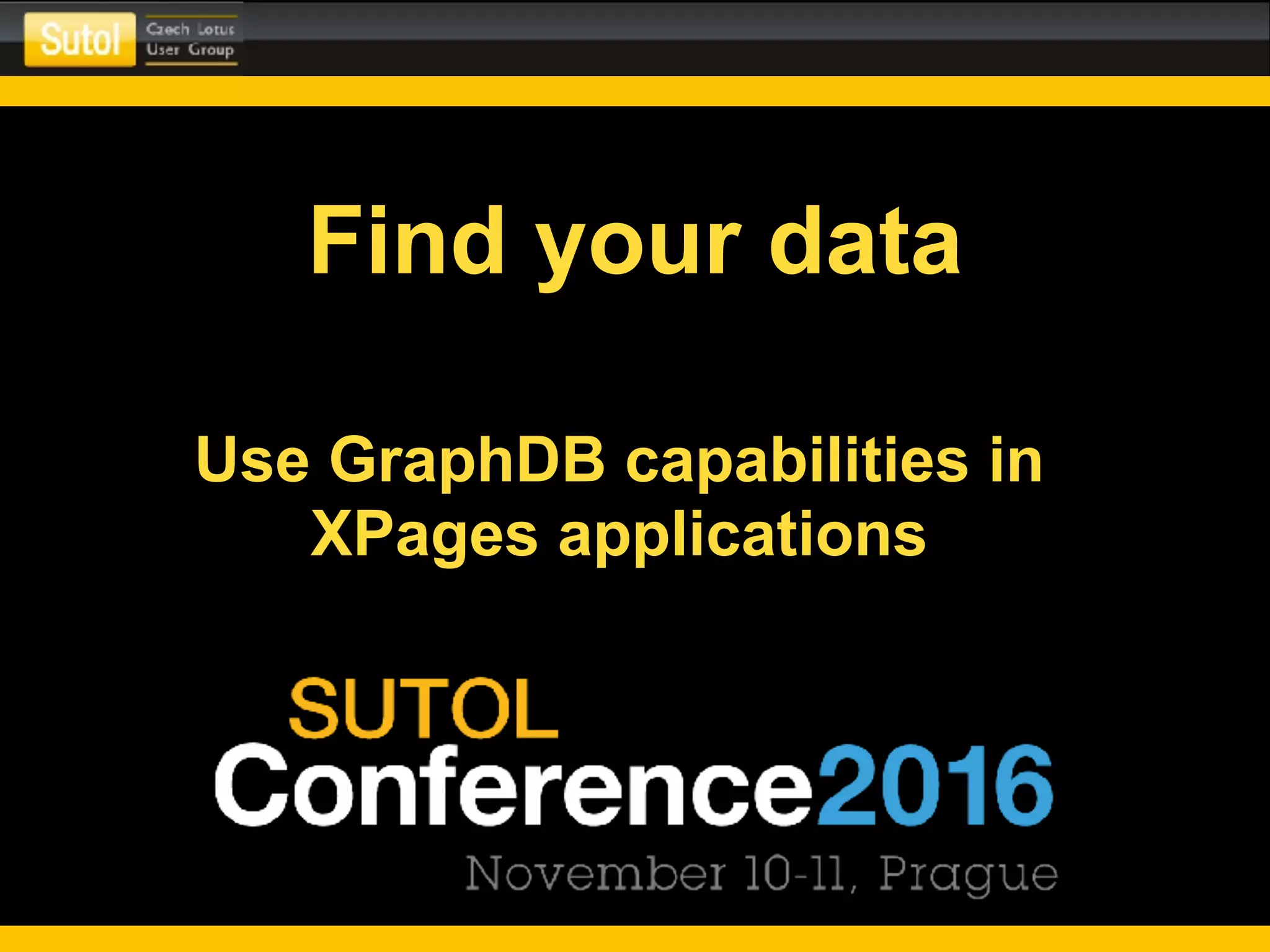 This document summarizes Oliver Busse's presentation on using Graph databases in XPages applications. It introduces Graph databases and their terminology like vertices and edges. It describes how GraphNSF, a Graph database implementation in Domino, stores vertices and edges as documents in NSF files. It provides examples of creating vertices and edges programmatically and adding metadata to existing data using a graph structure. It concludes with a live demo of a GraphNSF implementation in an XPages application.