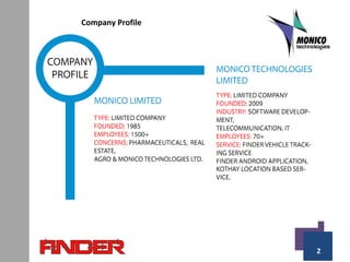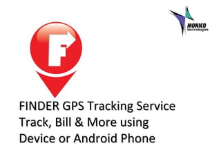 The document describes Finder GPS Tracking Service, which allows users to track assets, generate billing reports, and manage fleets using GPS devices or a mobile app. Key features include viewing current and past locations of tracked objects, generating reports on location, speed, and mileage, monitoring driver safety and fuel usage, and recovering stolen vehicles. The service provides benefits for fleet management, supply chain tracking, and generating authentic billing statements for transportation. Pricing details and contact information are provided.