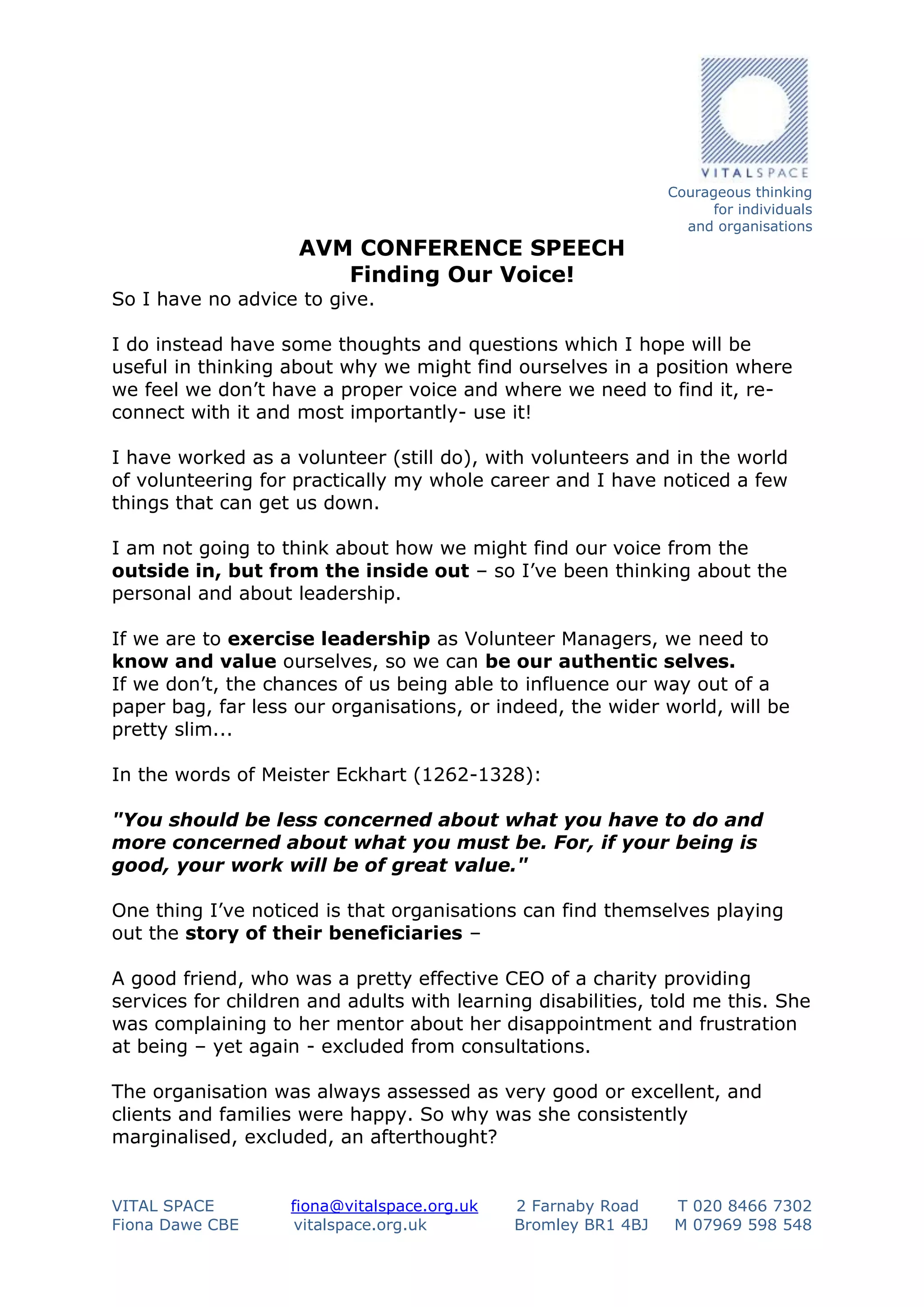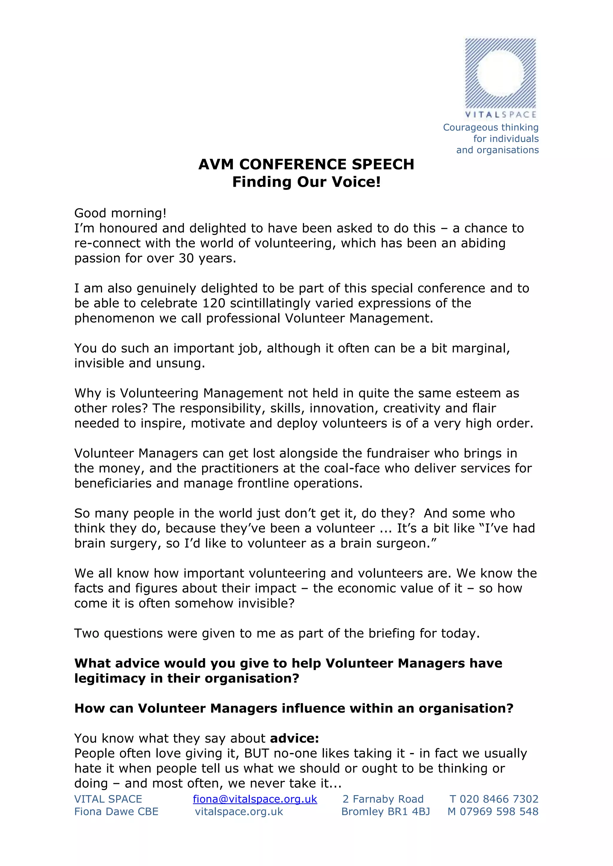 This document contains the text of a speech given by Fiona Dawe at an AVM conference on finding the voice of volunteer managers. In the speech, Dawe discusses how volunteer managers often feel undervalued in their organizations and provides suggestions for how they can gain legitimacy and influence. She shares examples from her experience of how empowering personal stories and changing limiting narratives can influence perceptions. Dawe encourages volunteer managers to question assumptions about themselves, define their value through a "true liberating assumption," and have courageous conversations to influence their organizations from the inside out.