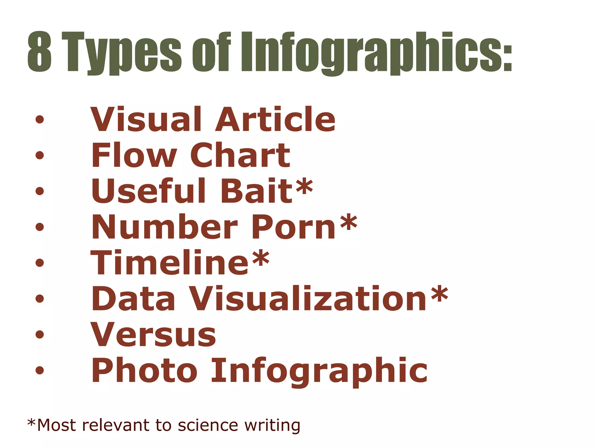 This document provides information on creating infographics, including 8 types of infographics such as visual articles, flow charts, timelines, and data visualizations. It recommends that the most relevant types for science writing are useful bait, number porn, timelines, and data visualizations. The document outlines basic steps for making an infographic, which include coming up with a question, researching it with data, choosing an infographic type, clarifying the objective and focus, choosing a creation site, hand sketching it, adding graphics, and choosing colors and fonts. It provides an example question about whether having children hurts female academics' careers and potential data to research for an infographic on that topic.