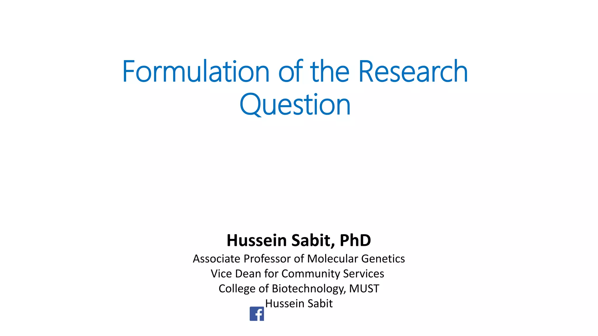 Hussein Sabit, PhD is an associate professor of molecular genetics and vice dean for community services at the College of Biotechnology. The document discusses various aspects of conducting research including defining a research problem, formulating research questions, different types of research (exploratory, descriptive, explanatory, predictive, pure, applied, theoretical, empirical), and the research process. It provides guidelines for selecting a topic, stating the problem, dividing it into subproblems, and checking if a question is suitable for research. The document emphasizes selecting an interesting, significant problem that can be solved given available resources and without ethical issues.