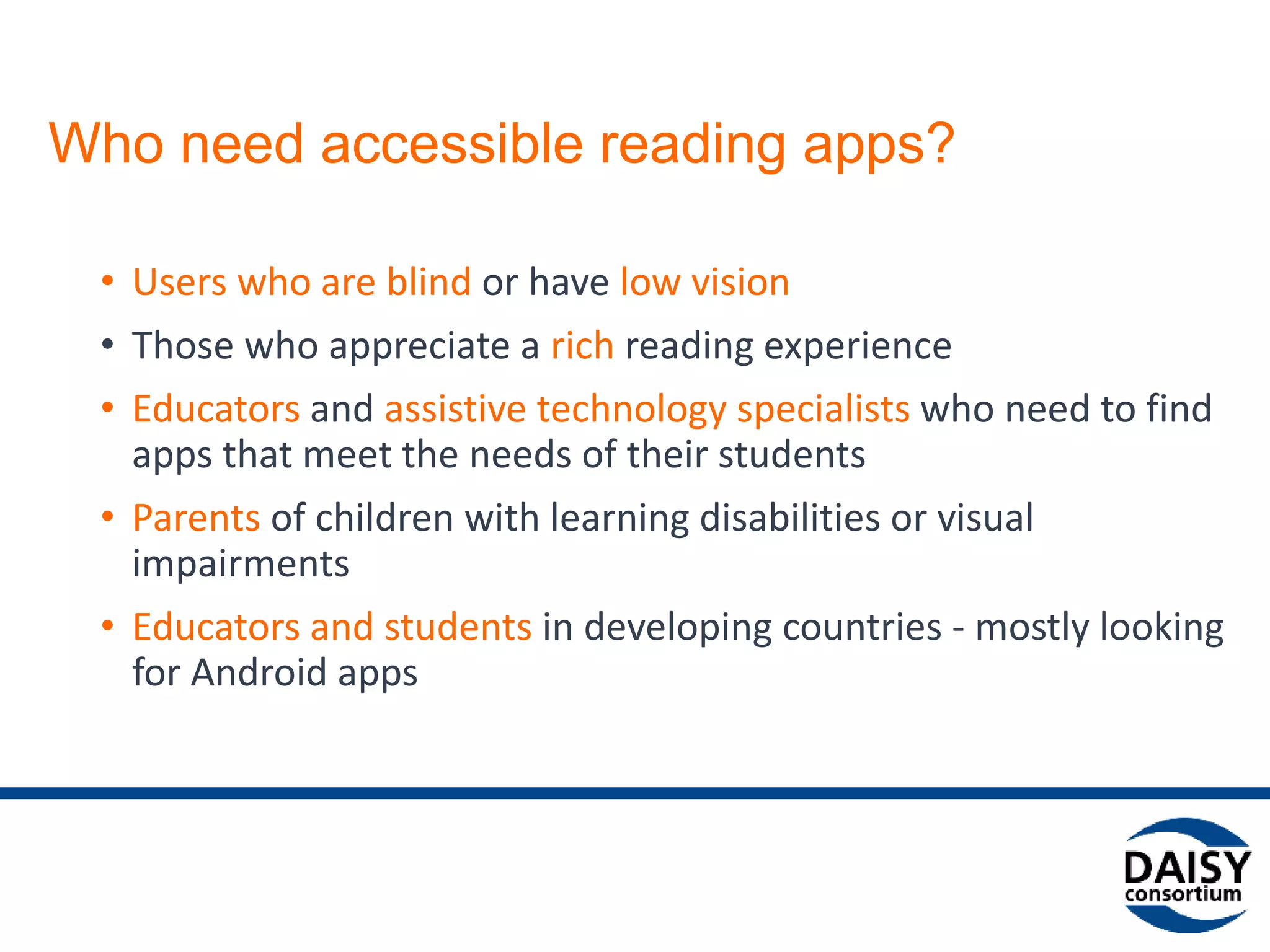 The document discusses various accessible reading apps designed for users with visual impairments, educators, and individuals with learning disabilities. It highlights specific apps such as Learning Ally, GoRead, BARD Mobile, and Voice Dream Reader, detailing their features and compatibility. The text emphasizes the importance of evolving technology and collaboration among developers to improve app accessibility and user experience.
