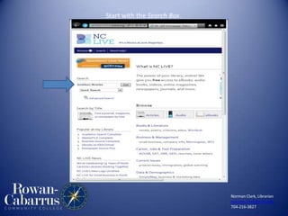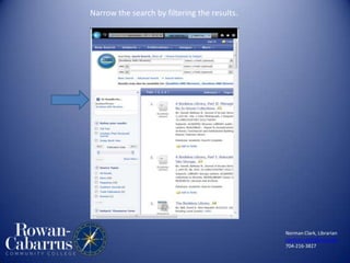 The document provides tips for searching the library catalog and databases from Norman Clark, a librarian at RCCC. It discusses starting searches with the catalog search box, filtering search results, finding specific journals, searching with keywords, and using subject-specific research guides. Contact information is provided for Norman Clark to assist with searches.