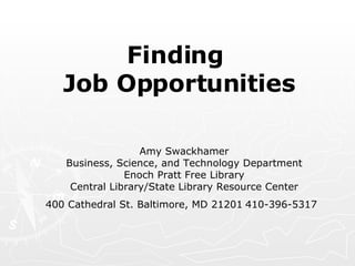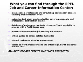 The document outlines resources and strategies for job seekers at the Enoch Pratt Free Library, including access to career books, study guides, and résumé review services. It emphasizes the importance of networking, informational interviews, and utilizing both posted and hidden job markets in the job search process. Additionally, it provides tips on skill inventory, setting goals, and organizing job search efforts effectively.