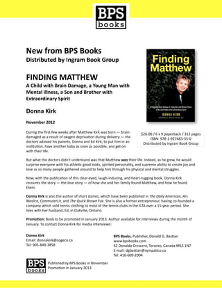 This document provides information about a new book being published titled "Finding Matthew" written by Donna Kirk. The book is a memoir that recounts Kirk's experience raising her son Matthew, who was born with brain damage due to oxygen deprivation during delivery. Despite doctors advising to institutionalize Matthew, Kirk and her family cared for him at home. The book details Matthew's struggles and accomplishments, as well as the love and support of his family. It will be promoted for interviews with the author in January 2013, shortly after its November 2012 publication by BPS Books. A short excerpt is included.