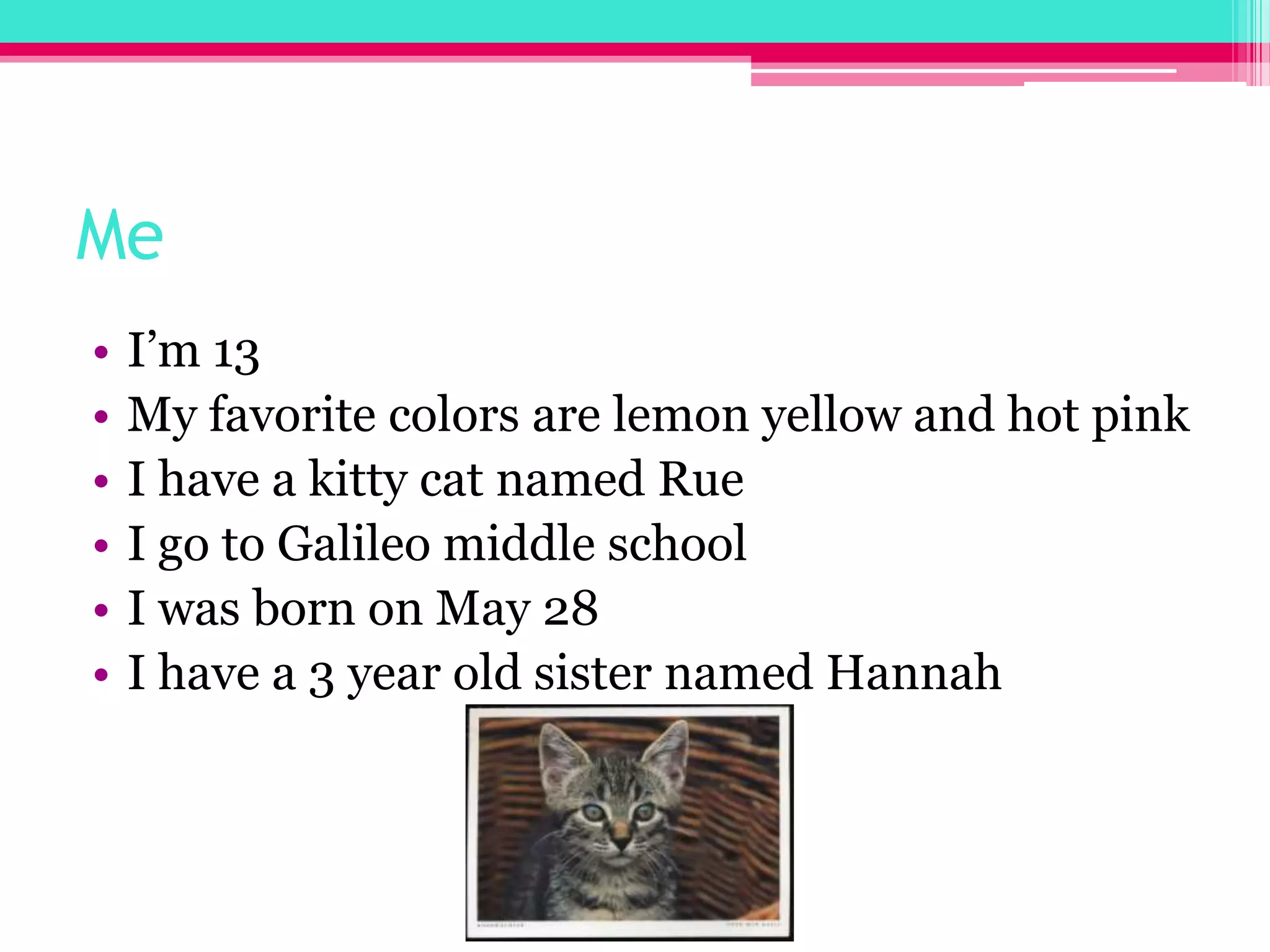 Miranda is a 13-year-old girl who enjoys playing softball, drawing, music, and riding her bike. She has a kitty cat named Rue and attends Galileo Middle School. Her parents are Danielle and Tomas and she has a step-mom Kelly and little sister Hannah. Miranda's career aspirations are to become a psychologist or architect. She wants to graduate high school by 18, finish college by 23, be married by 28, have two kids, and make enough money to own a decent house. Miranda feels she is important because she cares for friends and family and takes care of the earth.