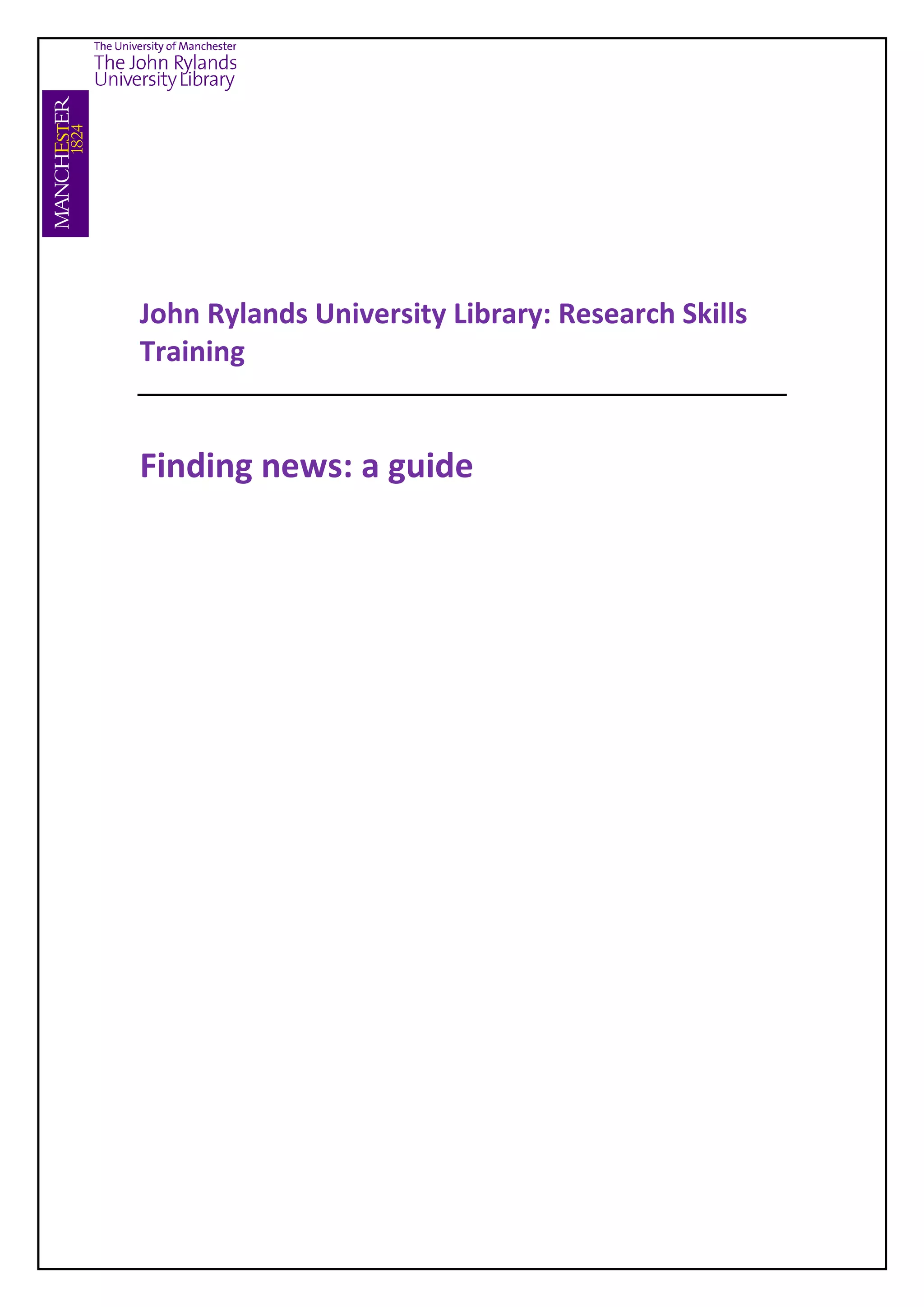 The document provides guidance on finding and accessing news sources for research through the John Rylands University Library. It discusses the benefits of using both historical and recent news items for research. It then describes how to search various electronic newspaper collections and databases like Factiva to access digitized news articles. It also provides examples of different search strategies and techniques that can be used within news databases.
