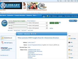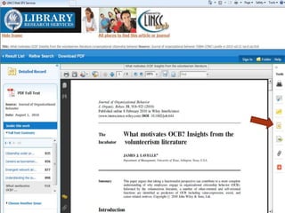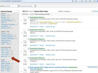 Scholarly journal articles are written by experts and researchers, are considered the gold standard for research sources, and are often required to be used for coursework. They can be found through the library website by searching for topics and filtering results to only include peer-reviewed articles. Useful articles can then be accessed through the database, with citations generated to include in bibliographies.