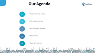 The document discusses the evolution and methodologies of image processing, particularly through the use of Convolutional Neural Networks (CNNs) and advancements such as Residual Networks (ResNet). It covers historical perspectives, various CNN architectures (like AlexNet and VGGNet), and highlights the improvements in learning capacity over the years. Additionally, it acknowledges the challenges faced in deep neural networks and outlines future research directions in the field.