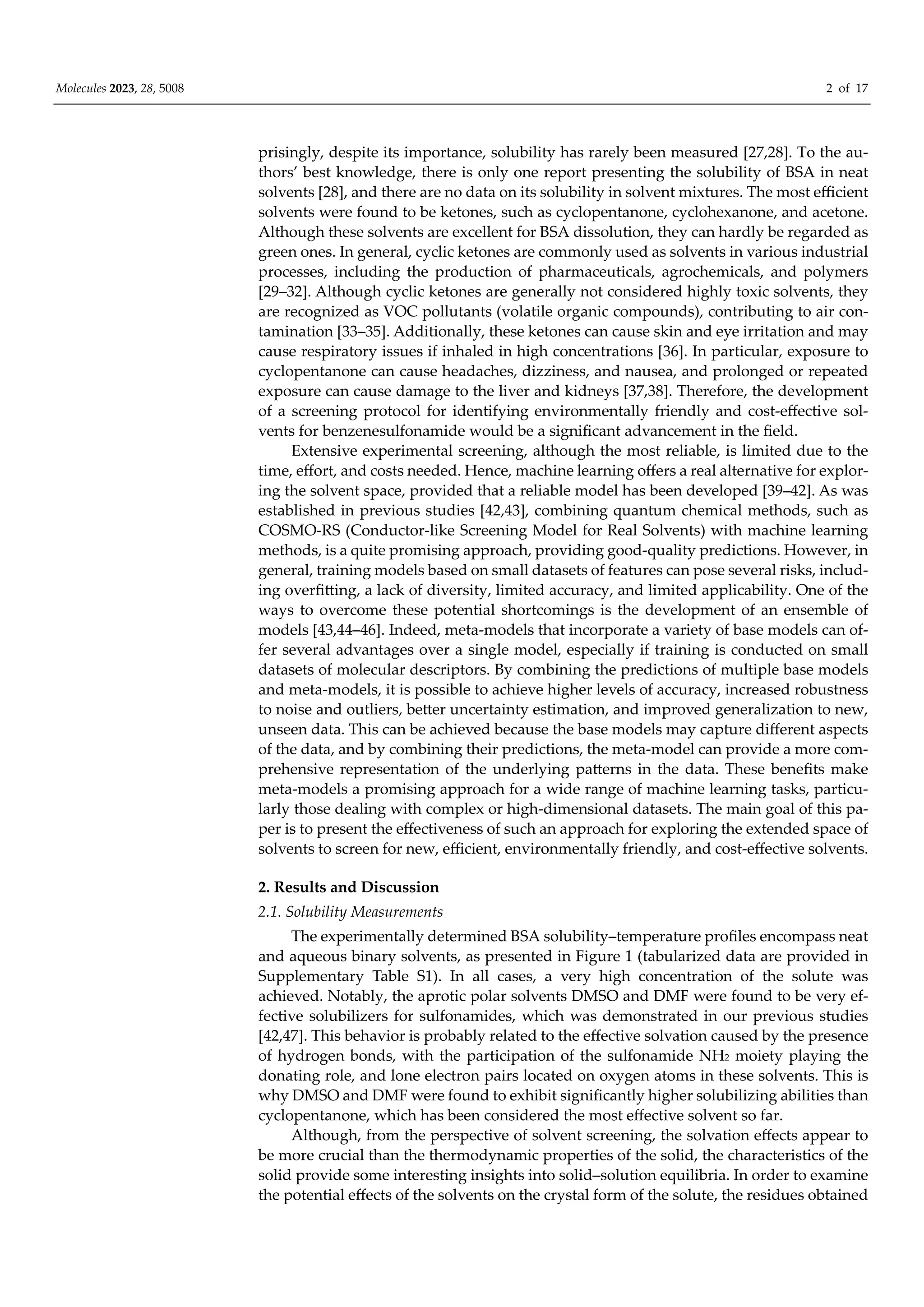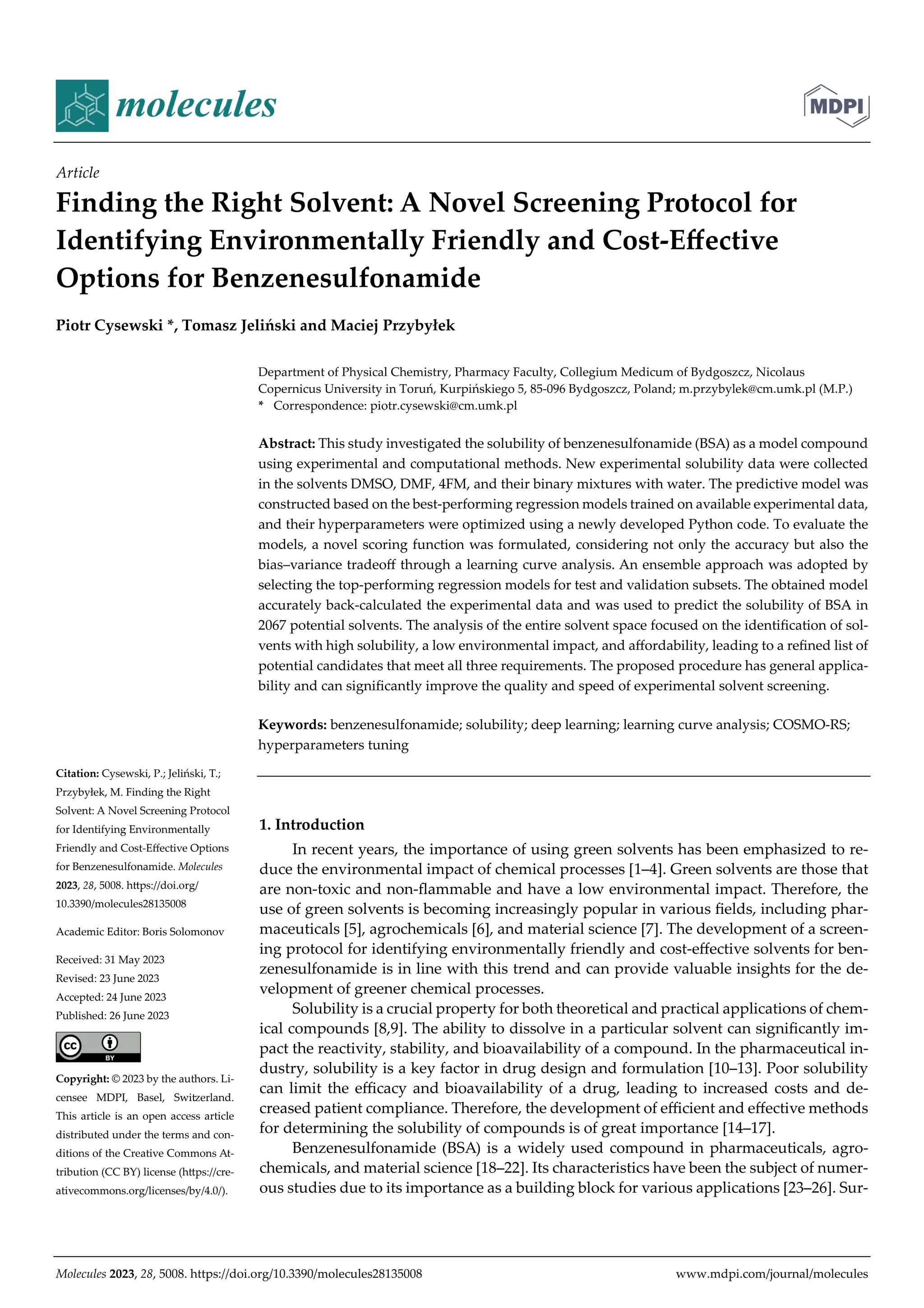 The study presents a novel screening protocol for identifying environmentally friendly and cost-effective solvents for benzenesulfonamide (BSA) using experimental and computational methods. It develops a predictive model based on regression techniques and machine learning, which successfully predicts the solubility of BSA in 2067 potential solvents, emphasizing the importance of green solvents in reducing environmental impact. The findings illustrate the effectiveness of an ensemble approach in improving the reliability and accuracy of solubility predictions.