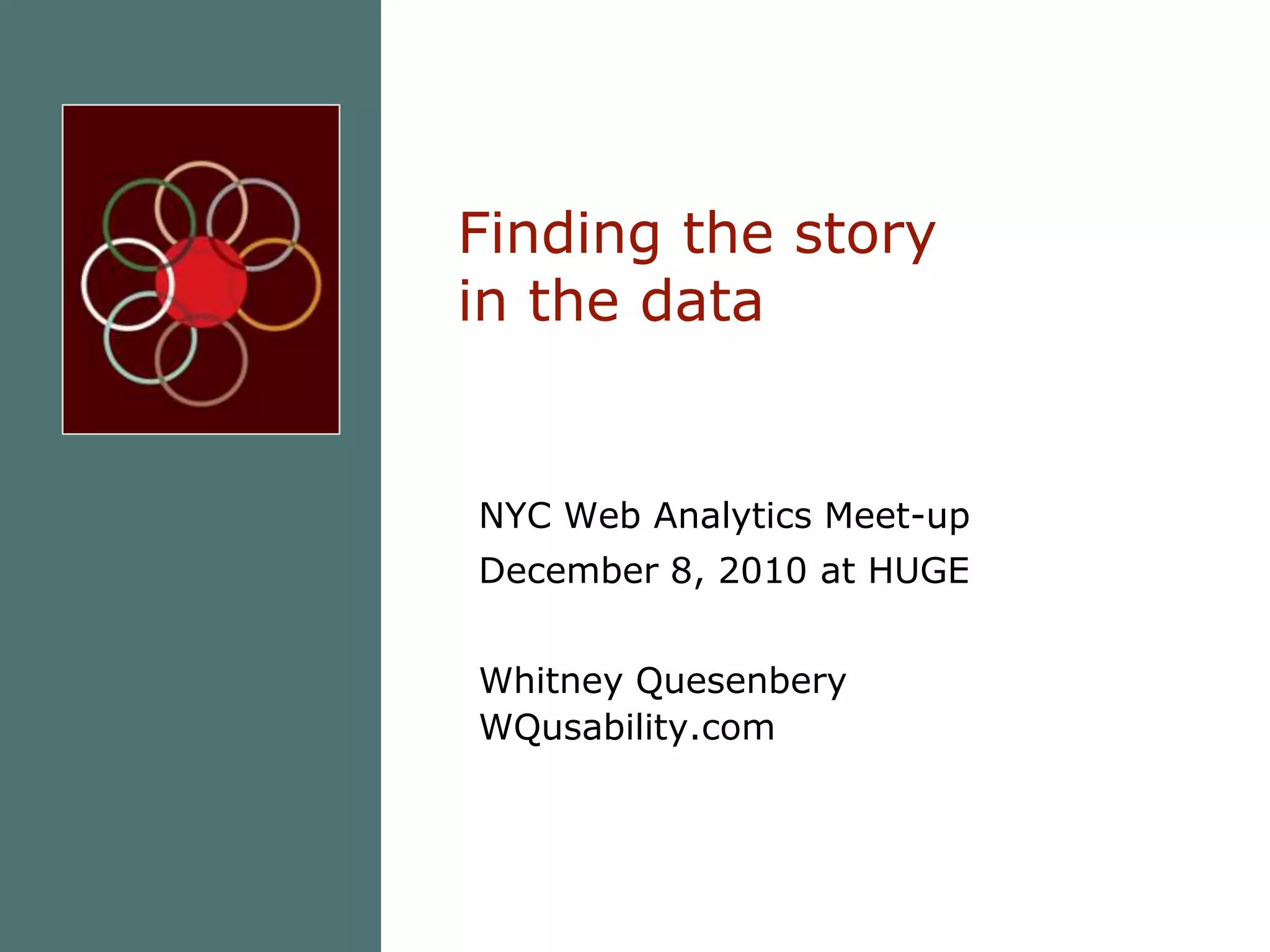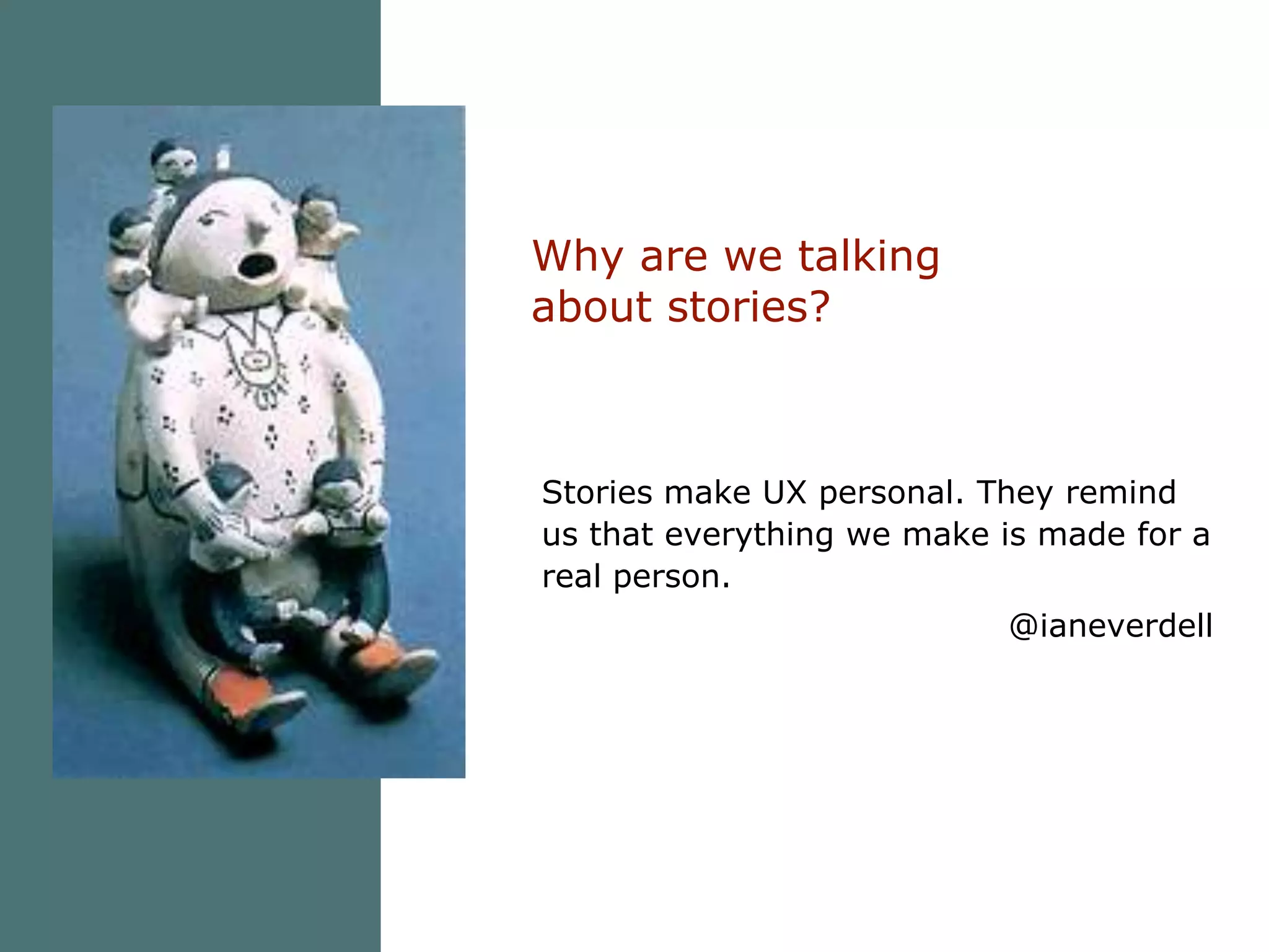 The document discusses how stories can be used to summarize and understand user experience (UX) data. It provides examples of how an organization used personas developed from user data to understand common user journeys. Stories were also used to explain unexpected search terms and highlight issues users faced navigating the website. Telling stories based on UX data helps connect colleagues to actual users and promotes empathy.