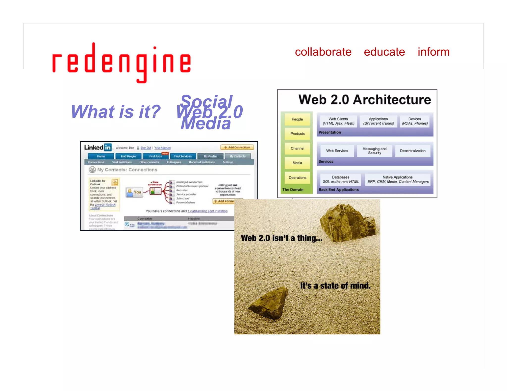 This document discusses how social media allows for collaboration, education and sharing of information. It outlines how users can access and share information easily online through technologies like wikis, blogs, podcasts and social networks. The document advocates that businesses should listen to online conversations and engage in social media to learn from customers, innovate products and services, and improve communication both internally and externally.