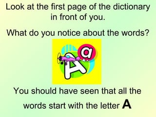 This document provides instructions for how to use a dictionary and discusses its key features. It asks the reader to look at the first page to see that the words begin with A. It then asks the reader to find the page for words beginning with B and to count the number of pages for words beginning with A. It also discusses the layout of dictionary pages and key features like words being in alphabetical order and having their meanings written next to them in bold.