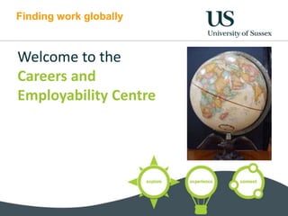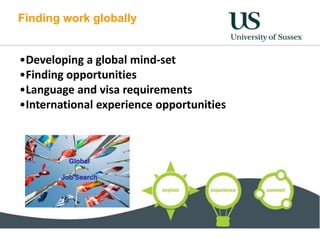 The document provides information for students at the University of Sussex on finding work globally, including developing an international mindset, gaining international experience through study abroad programs or placements, and searching for vacancies using various resources. It discusses the benefits that a UK degree provides for working internationally and highlights the university's strong international rankings and reputation.