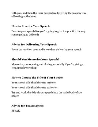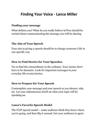 The document provides tips for finding your message, stories, and preparing to deliver an effective speech. It advises the reader to focus on a specific aim for their speech, find stories from their everyday life, and contemplate their topic while showering or commuting. The document also recommends practicing speeches as if delivering them, focusing on the audience, and memorizing openings and closings for long speeches.