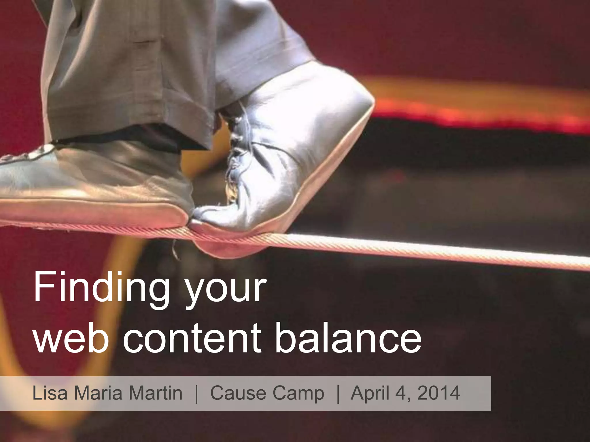 The document discusses the importance of a balanced content strategy for websites, emphasizing that purposeful content should align with the goals of both the organization and its audience. It outlines three critical factors for developing a successful content strategy: purpose, people, and process, stressing the need for clear ownership, support, and a defined workflow. Additionally, it encourages starting with manageable changes and gradual improvements to achieve an effective content balance.