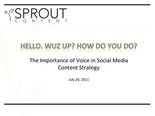 The document emphasizes the importance of voice in social media, highlighting that it should be consistent, relevant, valuable, and personable. It illustrates how voice can influence movements, history, brand identification, sales, and recognition, and suggests various platforms where voice can be applied. Additionally, the document encourages individuals to discover their unique voice to effectively communicate with their audience.