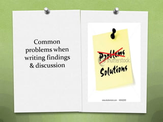 This document provides guidance for structuring findings from a research study. It recommends including 6 findings with at least 2 pieces of data to support each finding through triangulation of methods or participants. Findings and discussion should be in the same chapter. Data should be interpreted and evidence the intended revelation of each finding. The structure should have an interpretive title for each finding followed by a description, data evidence, and interpretation.