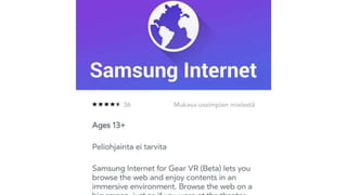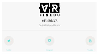 The document discusses the FinEduVR project which explores using virtual reality in education. It mentions using affordable VR goggles like Google Cardboard and hosting VR events for students like game jams. The project involves developing virtual learning environments and training teachers on VR tools. It also lists VR hardware released in 2016 like the HTC Vive and Microsoft Hololens as well as capturing 360-degree video with cameras for use in virtual environments.