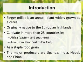 Finger millet, native to the Ethiopian highlands, is an important cereal crop cultivated in over 25 countries, with major production in Uganda, India, Nepal, and China. It requires specific climatic conditions and well-drained soils for optimal growth, and its production involves careful management practices including land preparation, irrigation, and pest control. The current annual production in Sri Lanka is about 6,400 metric tons, with efforts needed to enhance local seed production and achieve self-sufficiency.