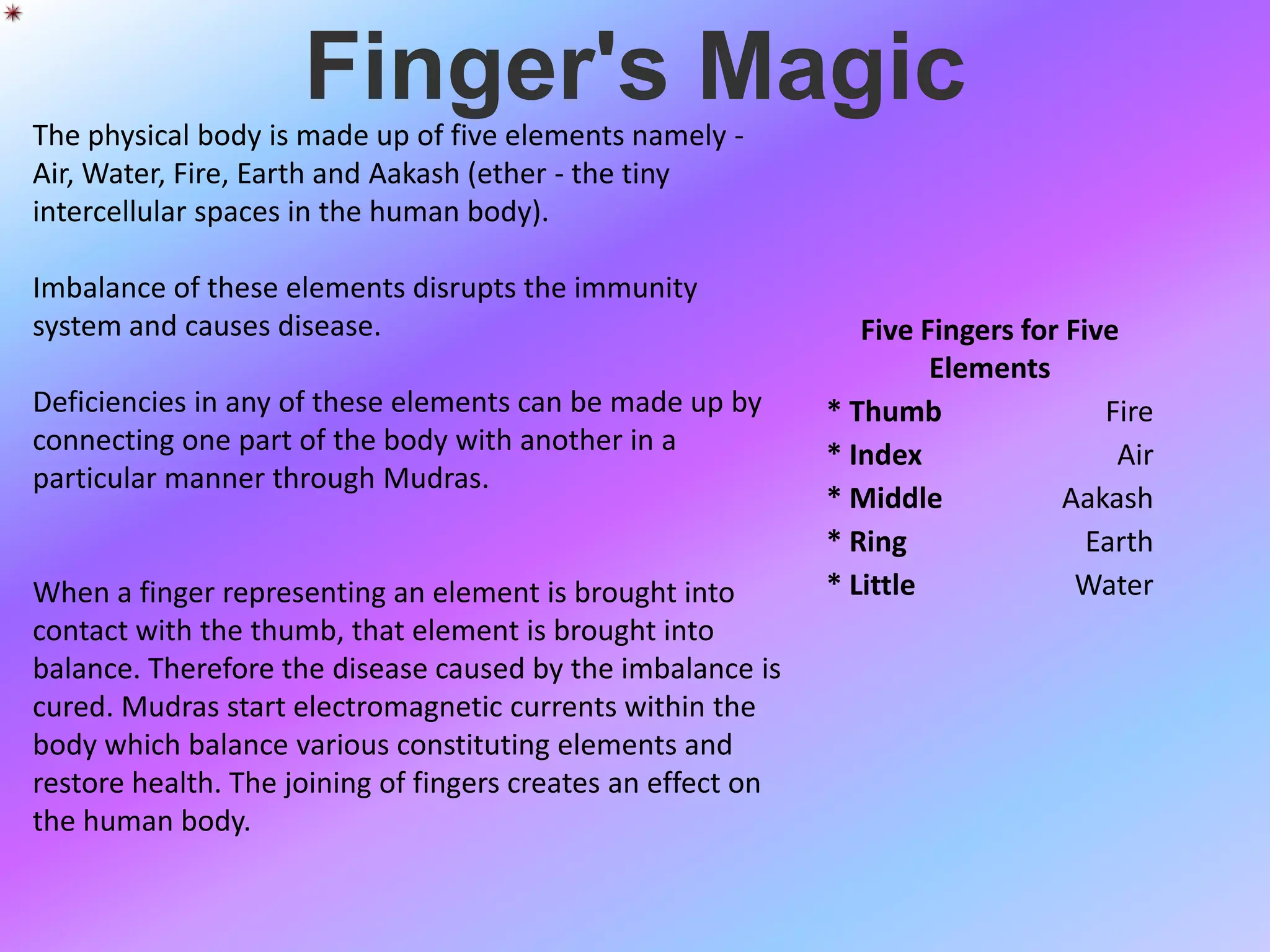 The document discusses various mudras (hand positions) and their benefits for physical and mental health. It describes mudras that correspond to different elements in the body (fire, air, ether, earth, water) and how bringing the corresponding finger into contact with the thumb can balance that element. Practicing mudras for 24 minutes daily or in shorter sessions can help cure diseases caused by elemental imbalances and improve overall health and wellness. Fifteen different mudras are then described in detail along with their uses and health benefits.