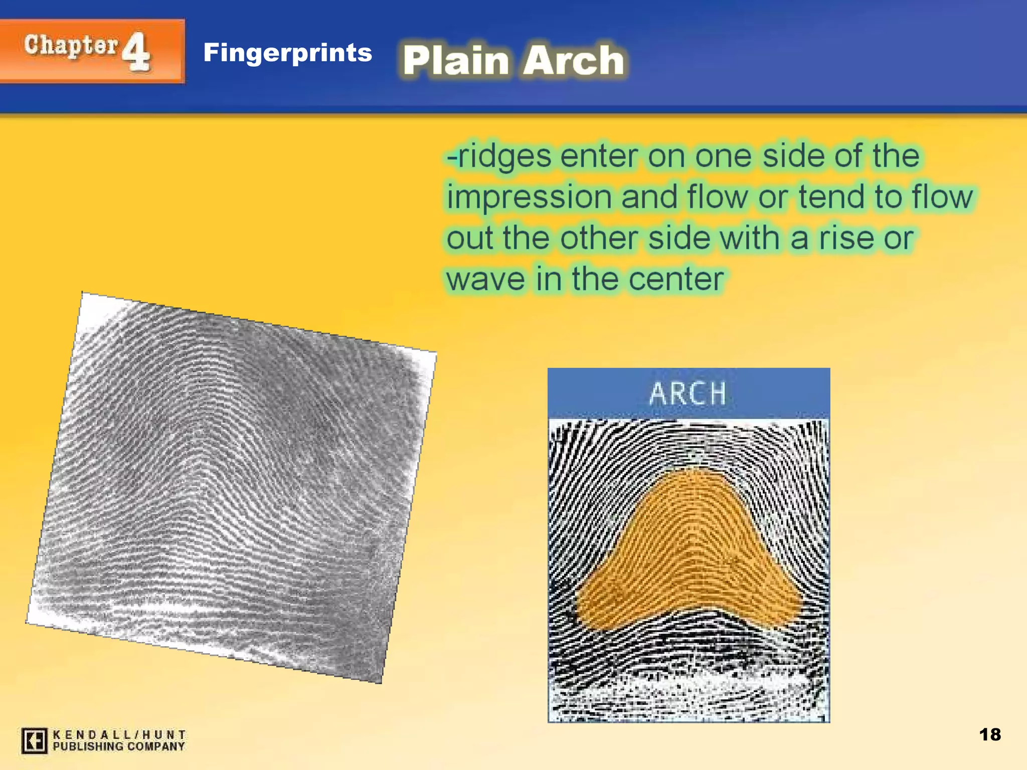 Arch An archhas friction ridges that enter on one side of the finger and cross to the other side while rising upward in the middle. They do NOT have type lines, deltas, or cores. Types Plain Tented Kendall/Hunt Publishing Company