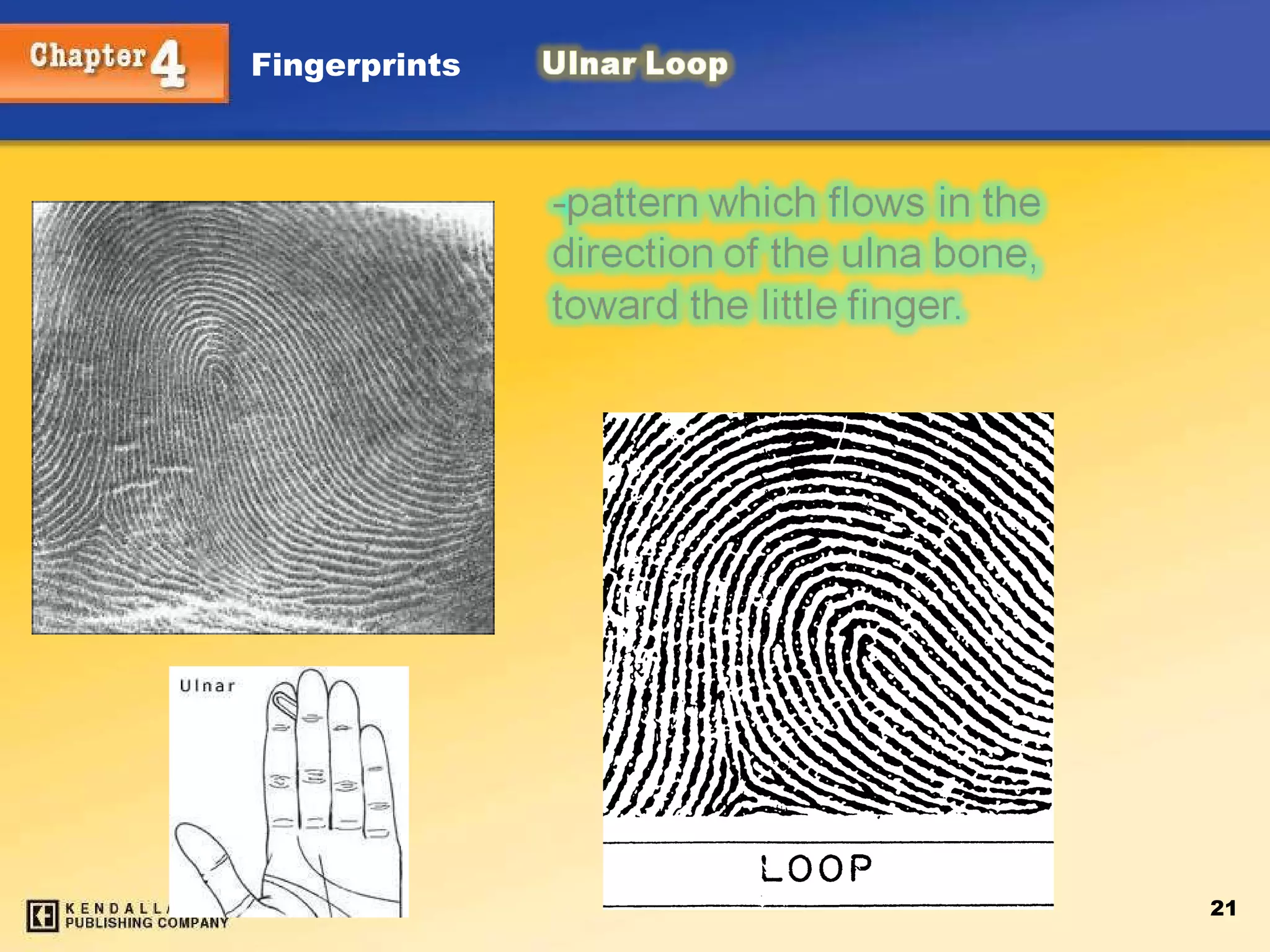 Loop A loopmust have one or more ridges entering and exiting from the same side. Loops must have one delta. Types Radial — opens toward the thumb Ulnar — opens toward the “pinky” (little finger) Which type of loop is this, if it is on the right hand? Left hand? Kendall/Hunt Publishing Company