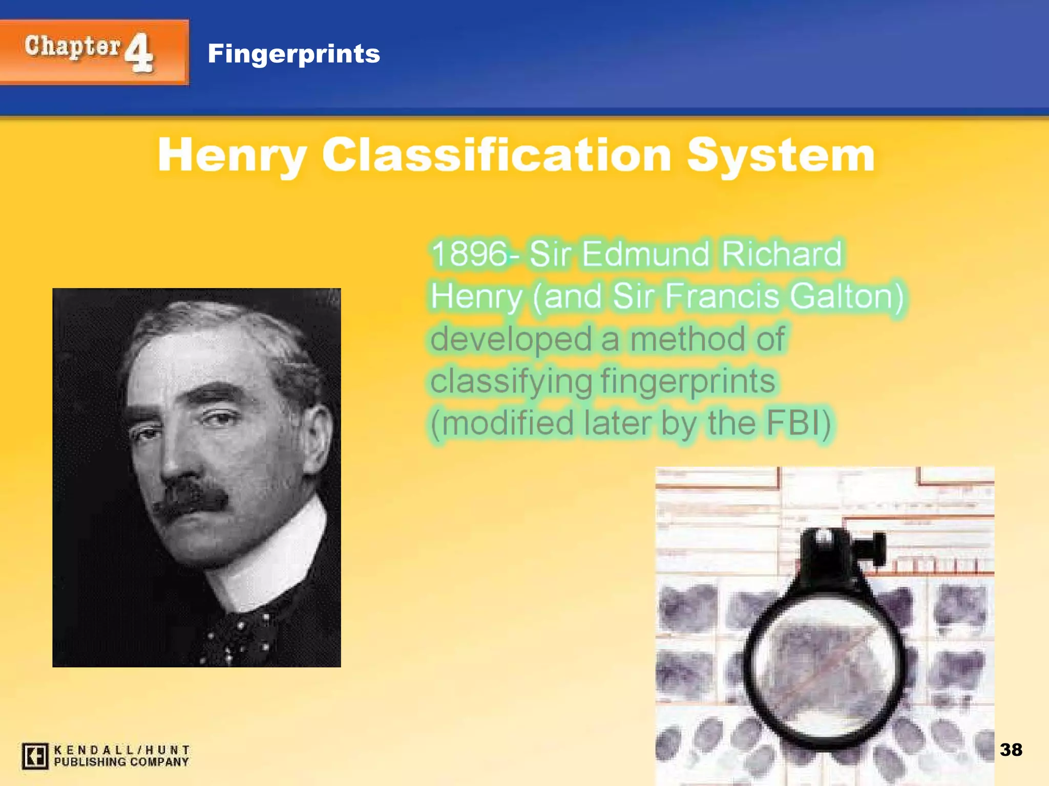 History from 1850to 1900 William Herschel — required Indians to put their fingerprints on contracts, and used fingerprints as a means of identifying prisoners Henry Faulds — claimed that fingerprints did not change over time and that they could be classified for identification Alphonse Bertillon — proposed body measurements as a means of identification; termed anthropometry Francis Galton — developed a primary classification scheme based on loops, arches, and whorls Edward Richard Henry — in collaboration with Galton, instituted a numerical classification system Juan Vucetich — developed a fingerprint classification system based on Galton’s that is used in Spanish-speaking countries Kendall/Hunt Publishing Company