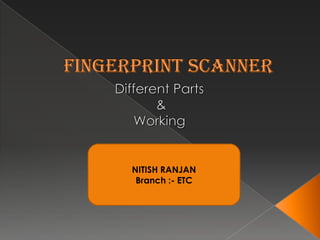 1. The main parts of a scanner are the prism, lens arrangement, and sensor. The prism reflects light from the finger onto the lens arrangement.