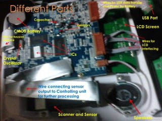 3. The electrical signal is sent to the control unit via wires for processing and storage. Additional components like the keypad interface, battery, crystal oscillator, and CMOS battery support operation of the device.