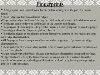 Fingerprints are formed during fetal development from ridges on fingers and palms. These ridges are unique to each individual. Fingerprint analysis relies on the permanence and individuality of ridge patterns and characteristics. Latent fingerprints left at crime scenes can be developed and identified by analyzing the ridge flow, patterns like loops and whorls, and minute characteristics called minutiae. Fingerprint evidence plays an important role in criminal investigations.
